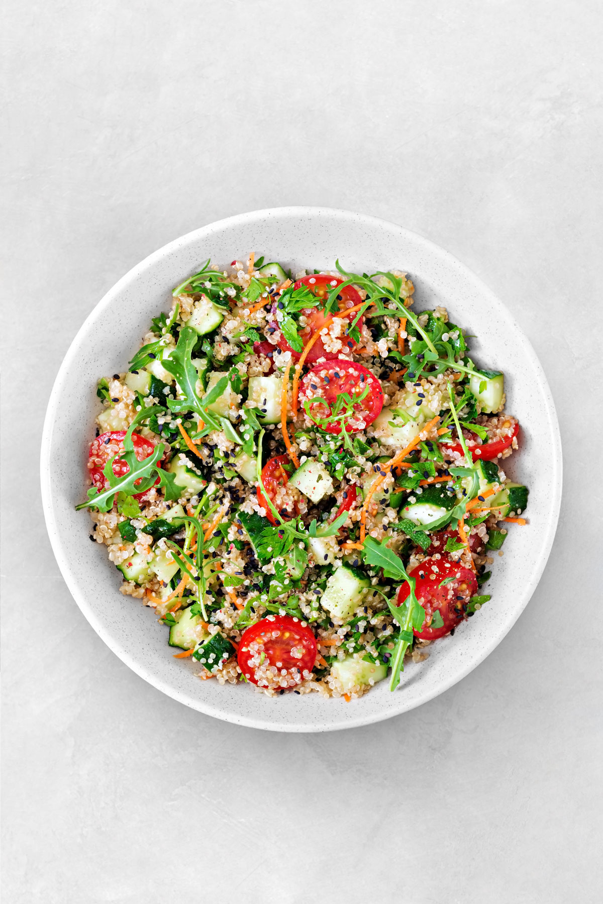 Feel free to enjoy this quinoa salad freshly-made, after a few hours at room temperature or cold from the fridge over the next few days.
